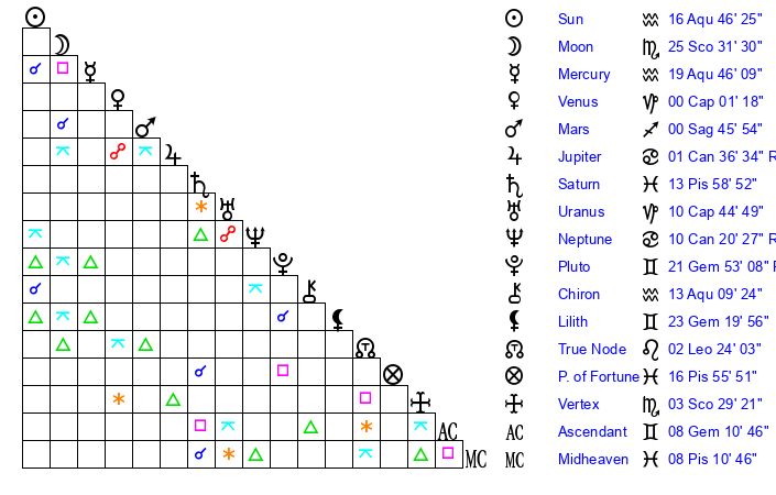 | Sun | 16 Aquarius 47 | 18 Aquarius 9 | 12 Gemini 54 |