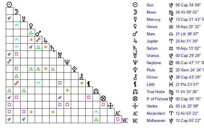| Moon | 24 Virgo 2 | 10 Sagittarius 59 | 20 Aquarius 50 |