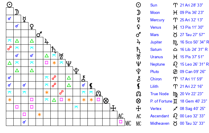Mercury | 25 Aries 33 | 27 Pisces 53 | 0 Leo 42 |