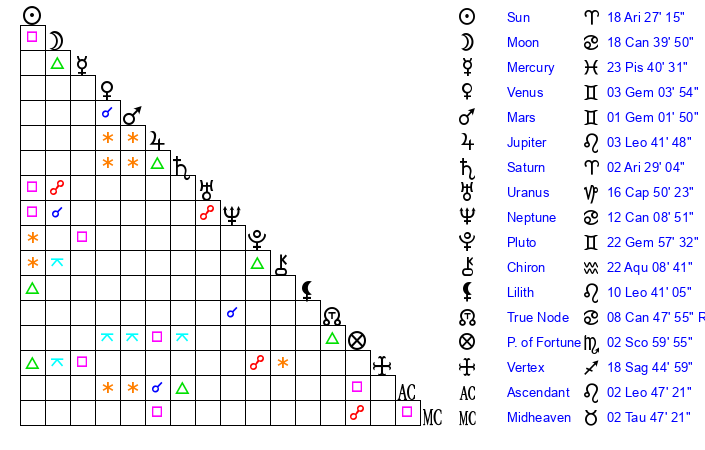 | Sun | 18 Aries 27 | 19 Aries 6 | 10 Leo 55 |