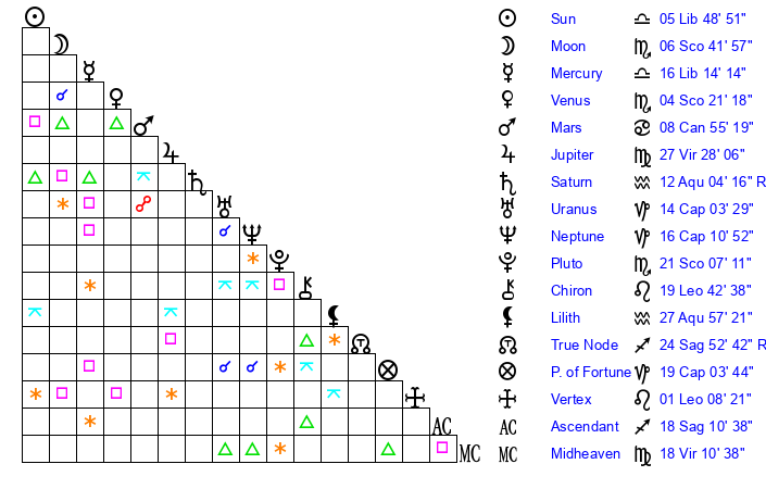 | Mercury | 16 Libra 14 | 17 Libra 30 | 2 Sagittarius 4 |