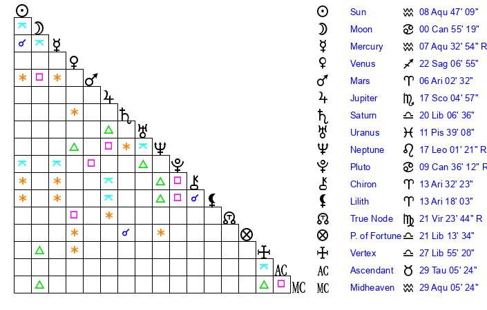 Moon | 0 Cancer 52 | 12 Aquarius 20 | 3 Aries 45 |