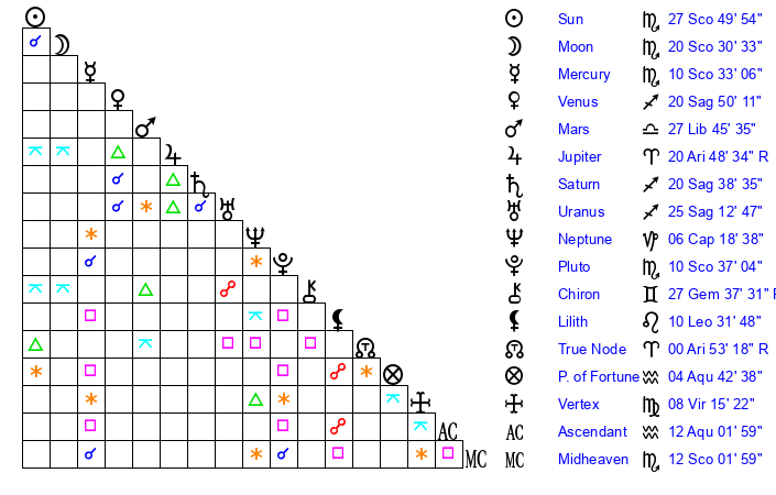 | Mars | 27 Libra 46 | 11 Sagittarius 43 | 22 Scorpio 45 |