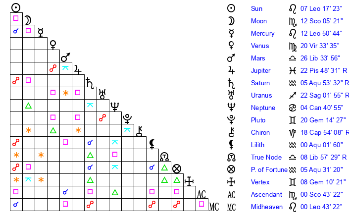 | Sun | 7 Leo 17 | 8 Leo 44 | 7 Sagittarius 19 |