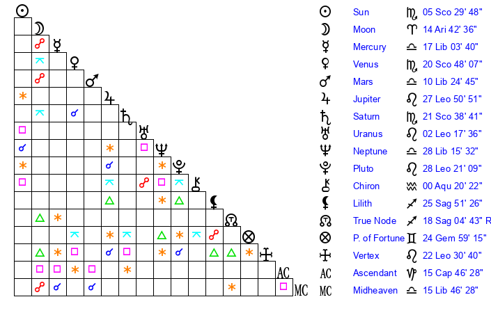 Moon | 14 Aries 38 | 6 Libra 9 | 5 Scorpio 38 |