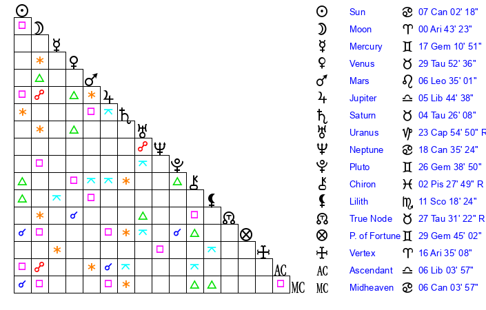 | Neptune | 18 Cancer 36 | 2 Aries 9 | 21 Cancer 34 |