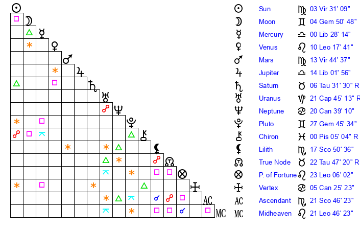 | Moon | 4 Gemini 44 | 25 Libra 50 | 25 Leo 14 |