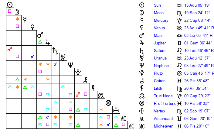 Sun | 15 Aquarius 5 | 16 Aquarius 8 | 0 Gemini 46 |