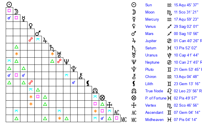 | Sun | 15 Aquarius 46 | 17 Aquarius 9 | 11 Gemini 57 |