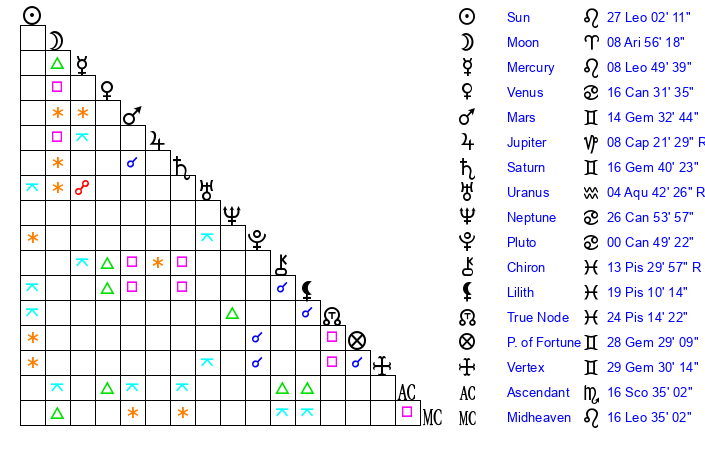 | Moon | 8 Aries 56 | 26 Cancer 17 | 13 Taurus 41 |