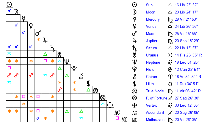 Sun | 16 Libra 24 | 17 Libra 41 | 29 Capricorn 26 |