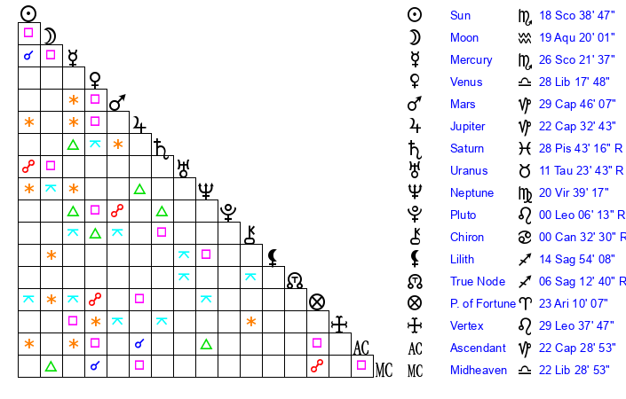 | Sun | 18 Scorpio 38 | 19 Scorpio 33 | 17 Aquarius 0 |