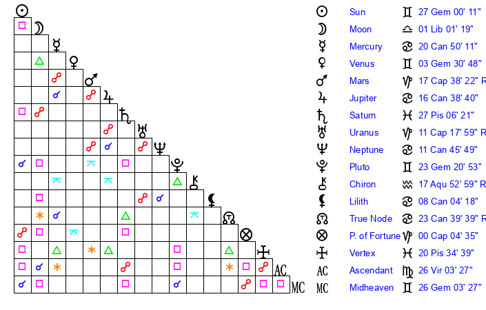 | Sun | 27 Gemini 0 | 28 Gemini 25 | 20 Libra 56 |