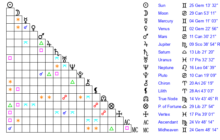 Sun | 25 Gemini 13 | 26 Gemini 31 | 3 Libra 18 |