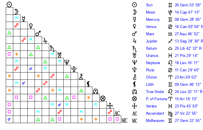 Moon | 14 Capricorn 45 | 22 Pisces 56 | 16 Virgo 29 |