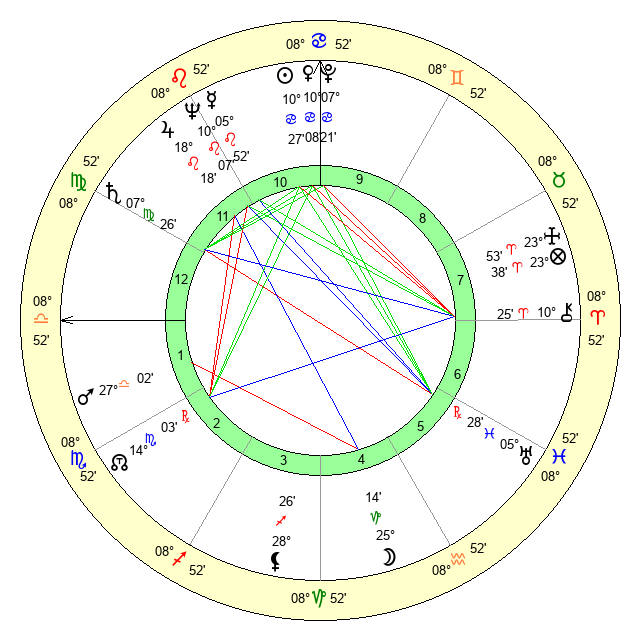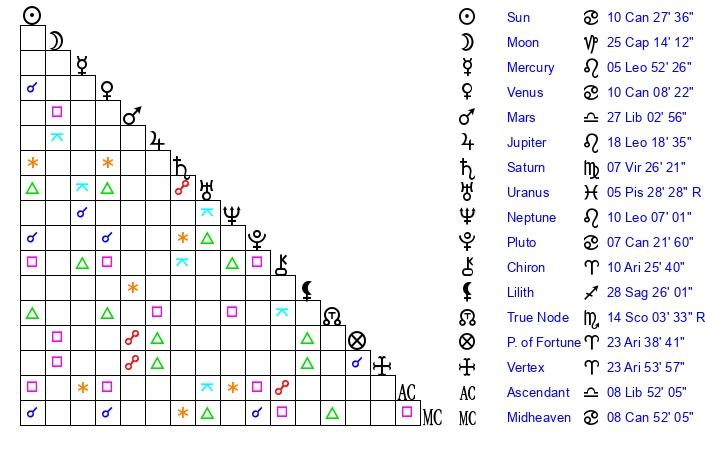 Sun | 10 Cancer 27 | 11 Cancer 4 | 22 Libra 2 |