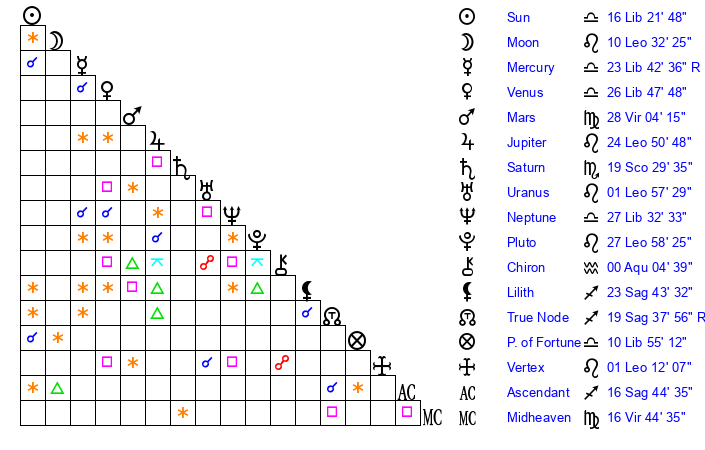| Moon | 10 Leo 26 | 3 Gemini 21 | 22 Aquarius 51 |