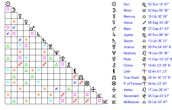 Moon | 2 Aquarius 15 | 9 Virgo 36 | 21 Libra 9 |