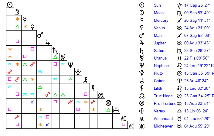 | Saturn | 23 Scorpio 56 | 15 Pisces 3 | 25 Scorpio 12 |