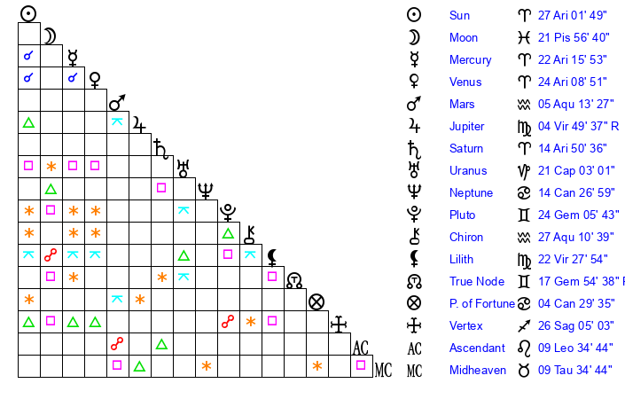 | Sun | 27 Aries 2 | 27 Aries 56 | 18 Leo 21 |