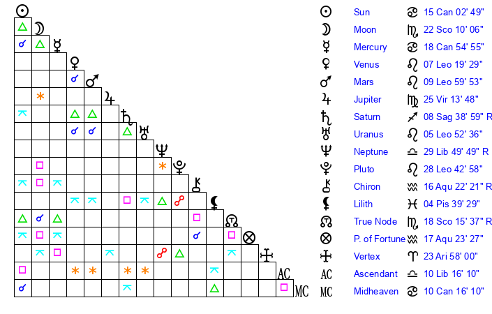 | Neptune | 29 Libra 49 | 2 Aries 10 | 0 Scorpio 51 |
