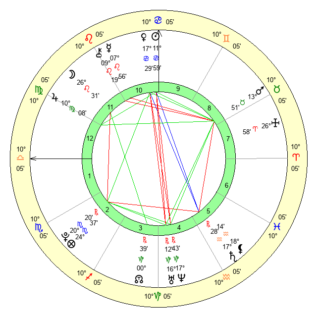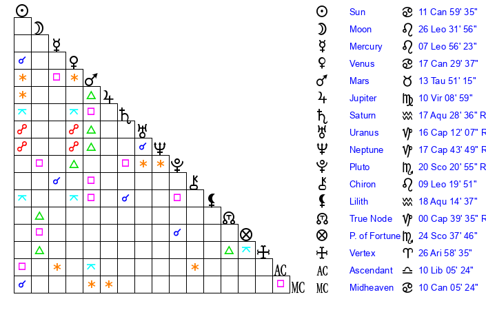 | Moon | 26 Leo 32 | 21 Libra 52 | 16 Scorpio 42 |