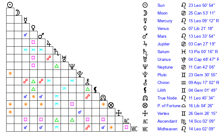 | Sun | 23 Leo 51 | 25 Leo 2 | 21 Sagittarius 49 |