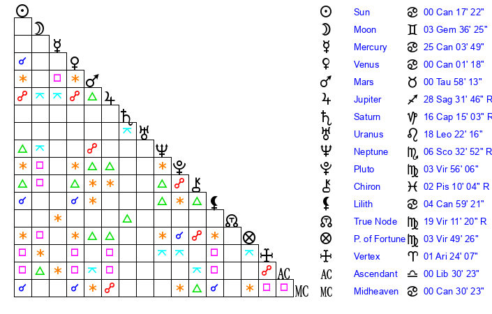 | Sun | 0 Cancer 17 | 0 Cancer 34 | 2 Virgo 28 |