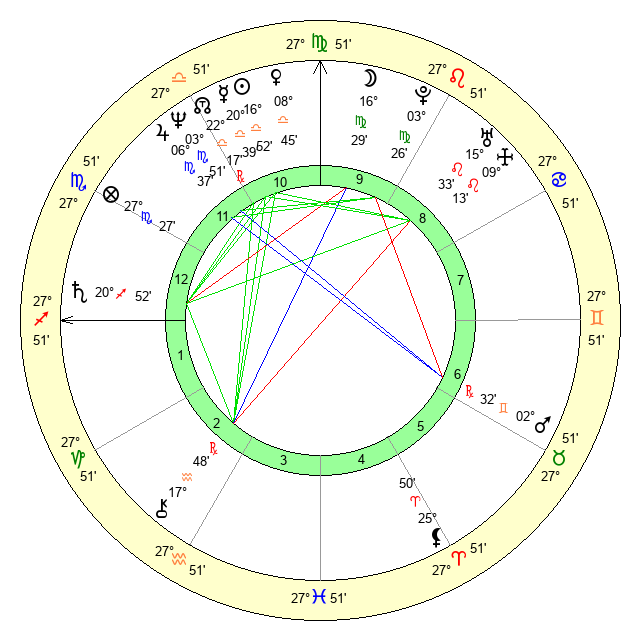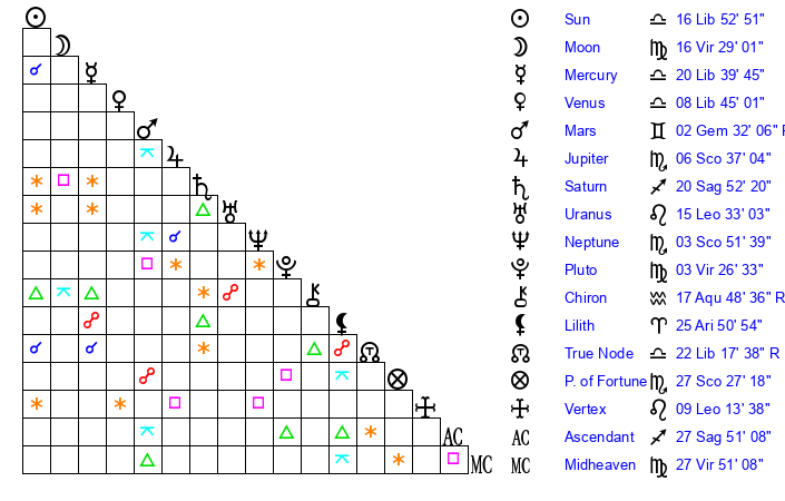 | Moon | 16 Virgo 27 | 7 Gemini 2 | 9 Pisces 56 |
