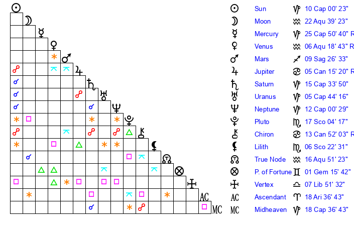 | Moon | 22 Aquarius 40 | 19 Capricorn 58 | 11 Gemini 10 |