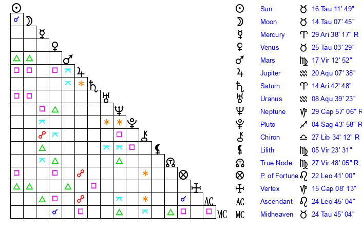 | Moon | 14 Taurus 8 | 10 Virgo 57 | 23 Taurus 8 |