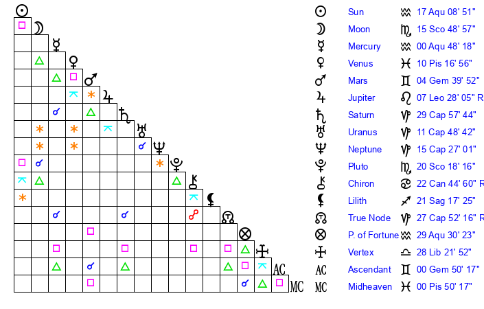 Moon | 15 Scorpio 49 | 2 Gemini 32 | 5 Aquarius 14 |