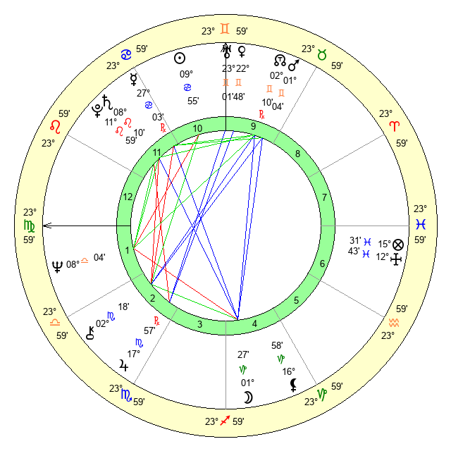 | Sun | 9 Cancer 55 | 11 Cancer 1 | 24 Virgo 53 |