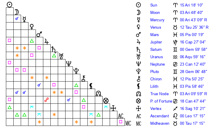 | Sun | 15 Aries 18 | 16 Aries 9 | 3 Leo 4 |