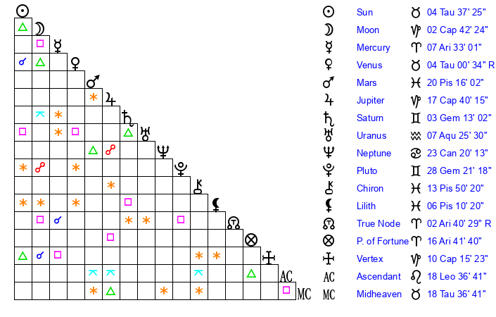 | Moon | 2 Capricorn 45 | 2 Aries 17 | 6 Aquarius 26 |