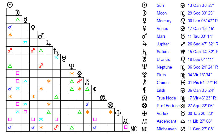 | Venus | 17 Cancer 14 | 1 Gemini 10 | 7 Libra 16 |