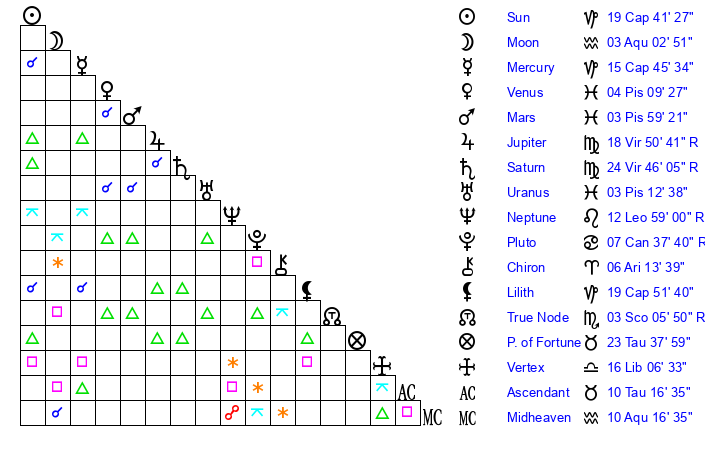 Neptune | 12 Leo 58 | 27 Pisces 27 | 10 Leo 57 |