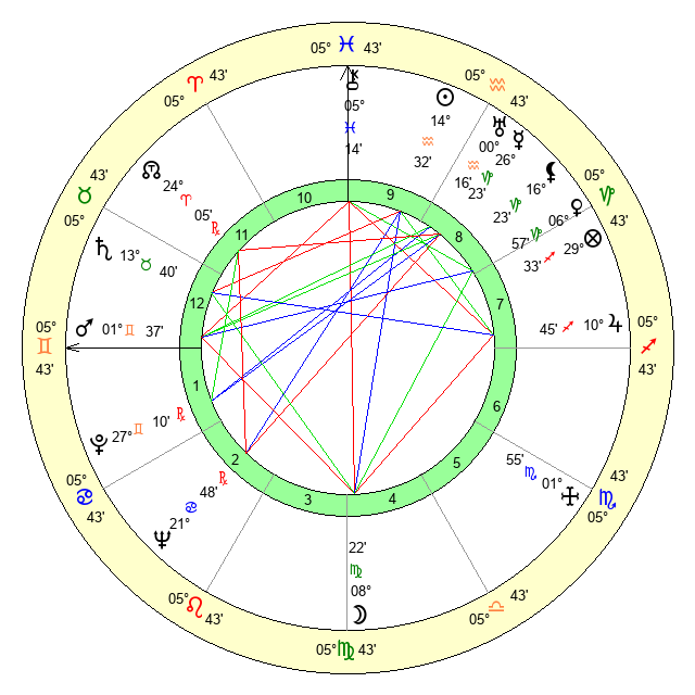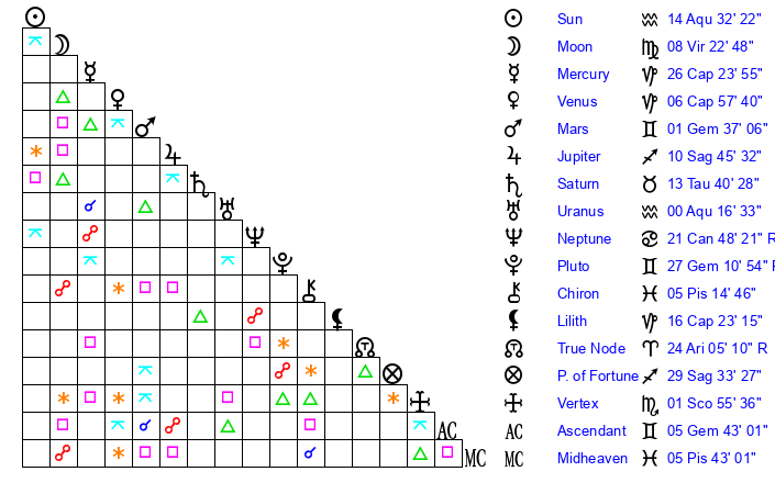 | Sun | 14 Aquarius 32 | 16 Aquarius 8 | 6 Gemini 0 |