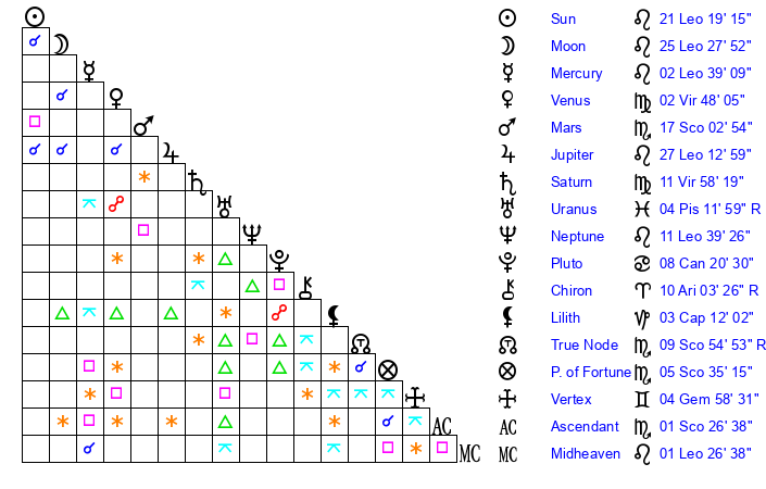 Sun | 21 Leo 19 | 21 Leo 55 | 4 Sagittarius 55 |