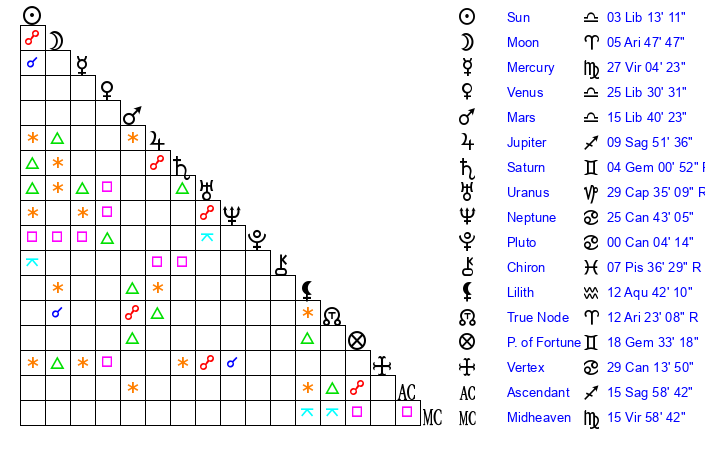 | Sun | 3 Libra 13 | 3 Libra 51 | 27 Capricorn 1 |