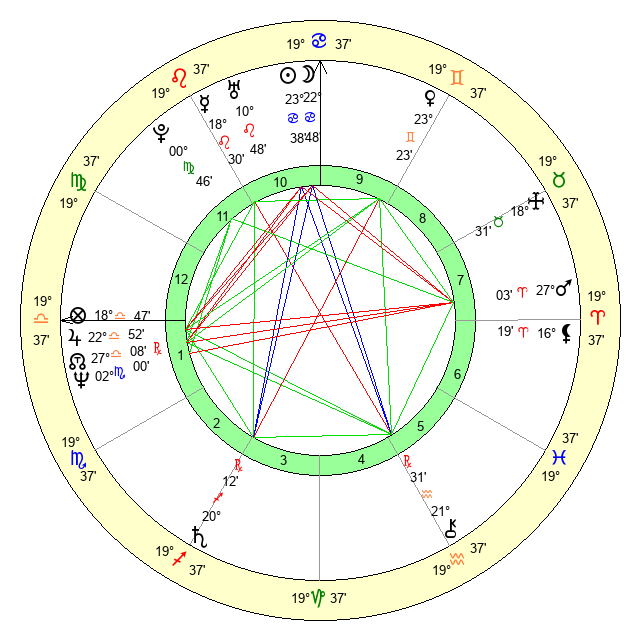 | Moon | 22 Cancer 50 | 7 Aries 7 | 17 Capricorn 37 |