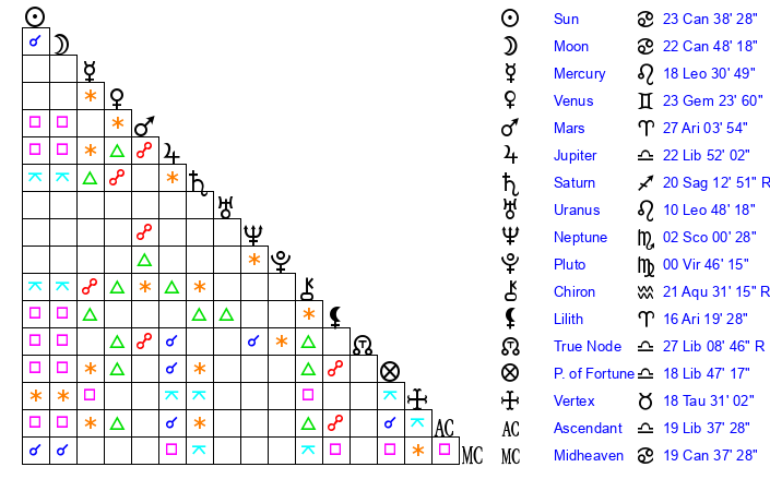 | Sun | 23 Cancer 38 | 24 Cancer 25 | 28 Virgo 12 |