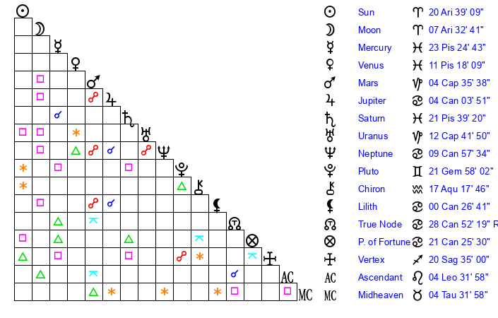 | Sun | 20 Aries 39 | 22 Aries 3 | 14 Leo 1 |