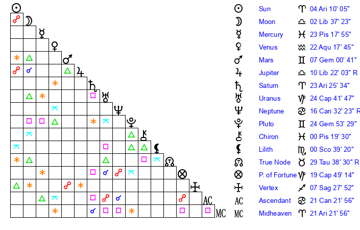 | Moon | 2 Libra 32 | 14 Aquarius 24 | 12 Sagittarius 50 |