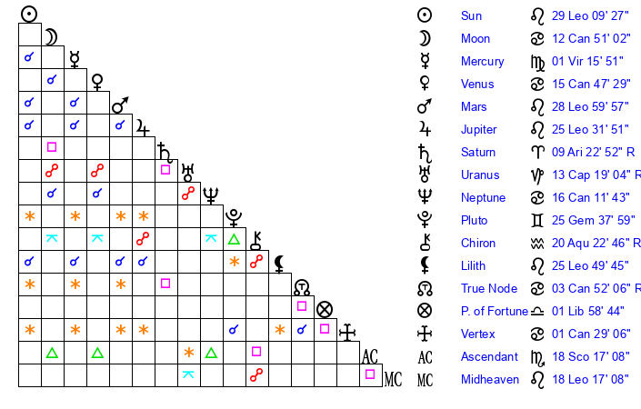 | Mars | 23 Pisces 19 | 1 Leo 41 | 13 Gemini 41 |