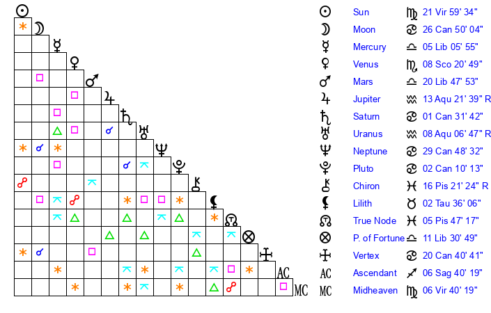 | Sun | 21 Virgo 59 | 23 Virgo 6 | 13 Capricorn 16 |
