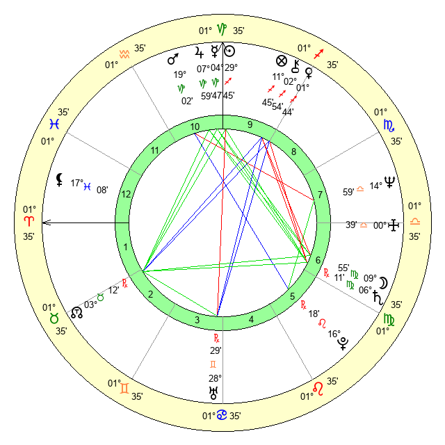 | Moon | 9 Virgo 45 | 17 Virgo 1 | 12 Gemini 56 |