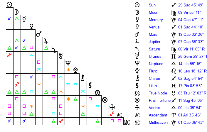 | Sun | 29 Sagittarius 46 | 0 Capricorn 20 | 16 Pisces 48 |