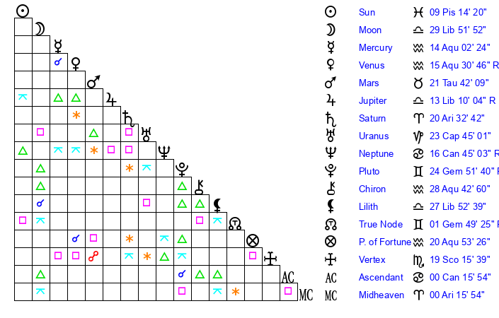 | Moon | 29 Libra 48 | 19 Pisces 32 | 11 Capricorn 25 |