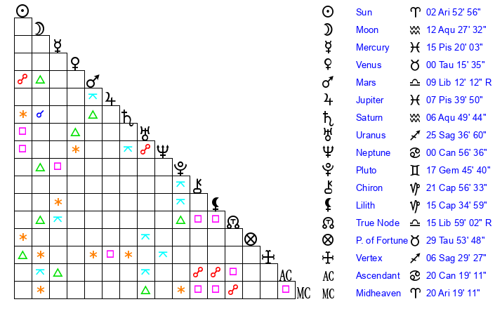 | Saturn | 7 Aquarius 16 | 23 Pisces 32 | 6 Aquarius 56 |